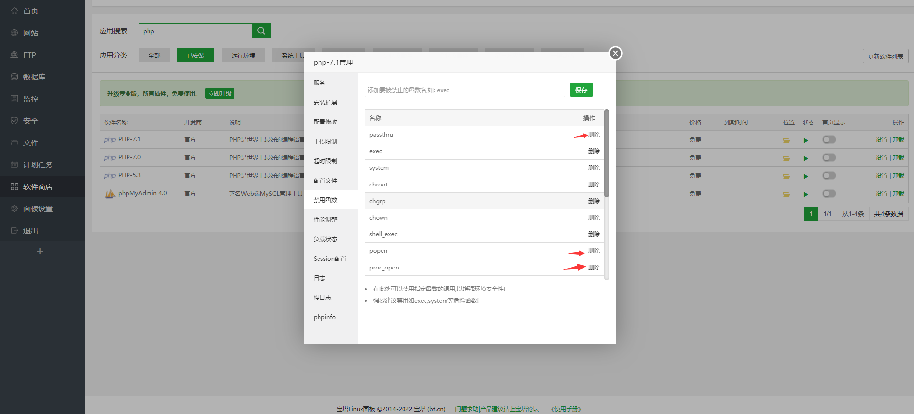 禁用函数,删除putenv,proc_open,popen,passthru这4个函数的禁用。