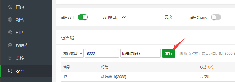 在宝塔面板侧边菜单打开 安全 ,放行 8000 号端口,后续安装服务会用得上。