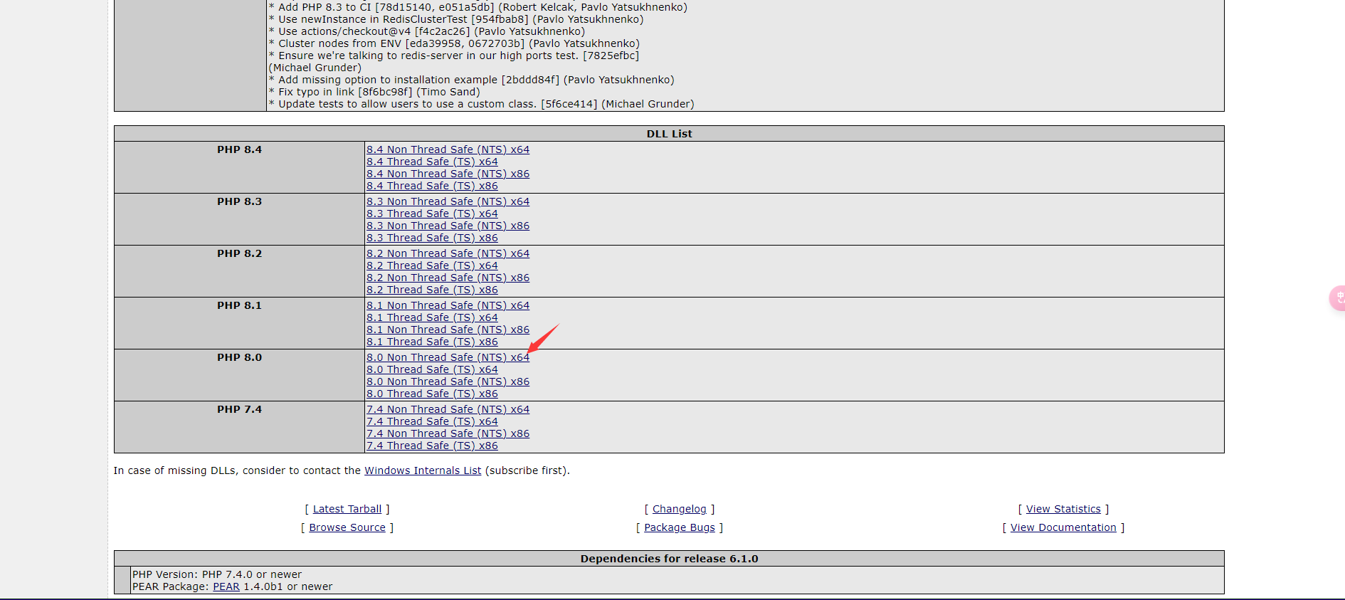 5. 进入 DLL 页面后,将页面滑至底部,找到您当前环境的对应的包进行下载,主要确认:php版本、计算机系统架构、NTS/TS