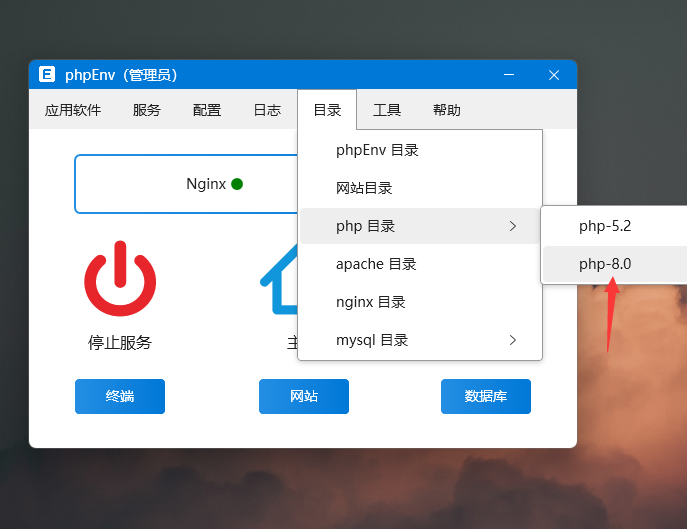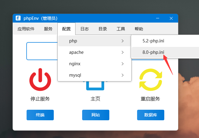 3. 找到已安装的 PHP,点击右侧设置按钮(php版本需要 >= 8.0.2,截图仅为示例