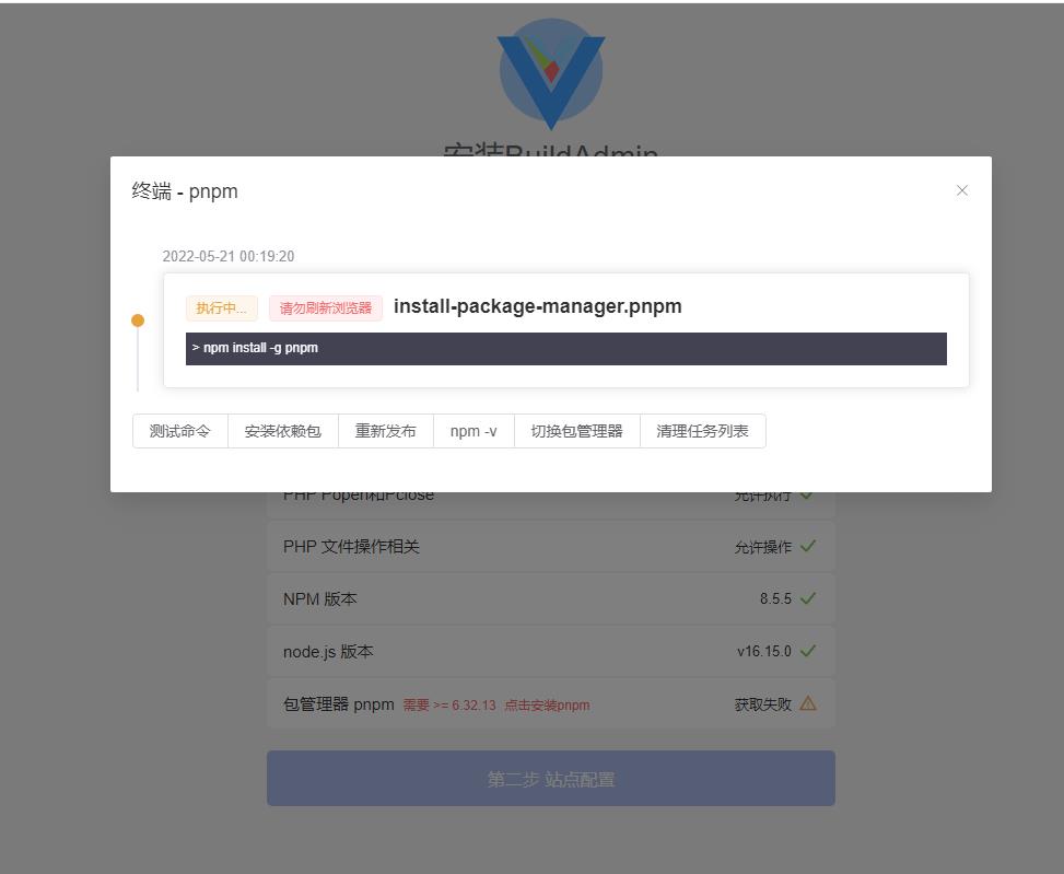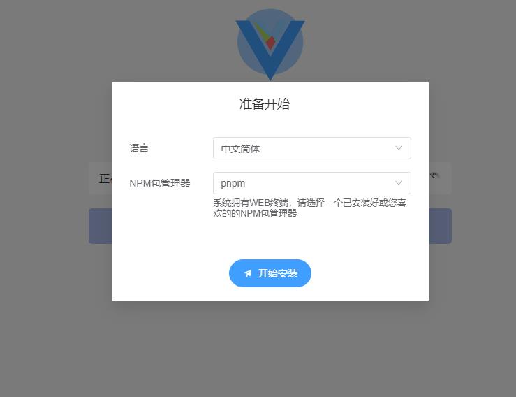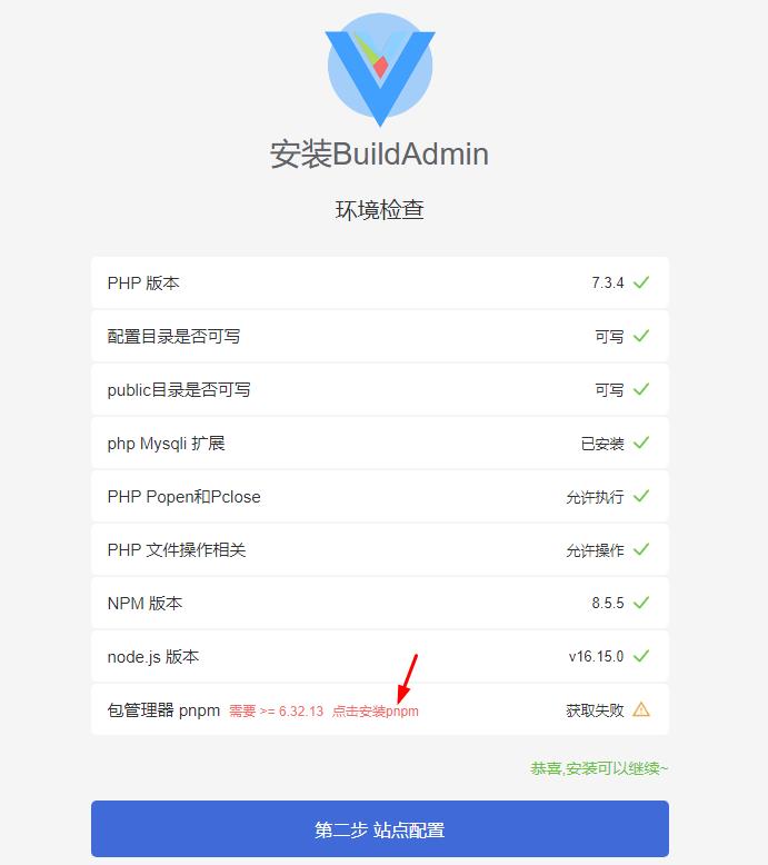 若命令执行失败,跳转到了手动完成未尽事宜页面,请根据引导手动完成安装(您也可以点击右下角终端重试 安装依赖包 和 重新发布 ),随后访问:http://127.0.0.1:8000/index.html/#/admin